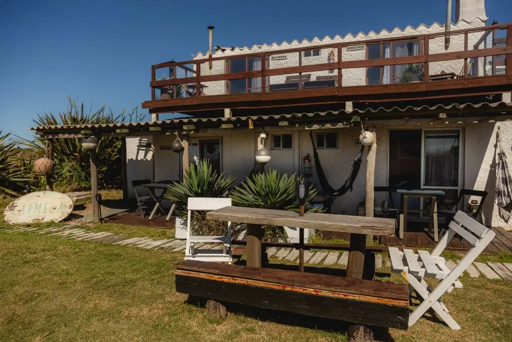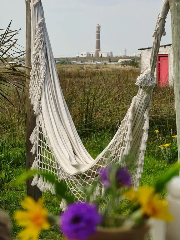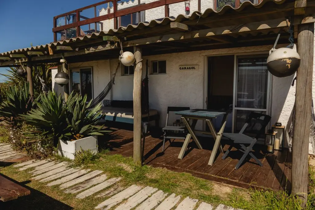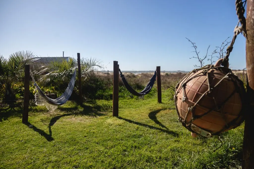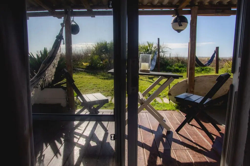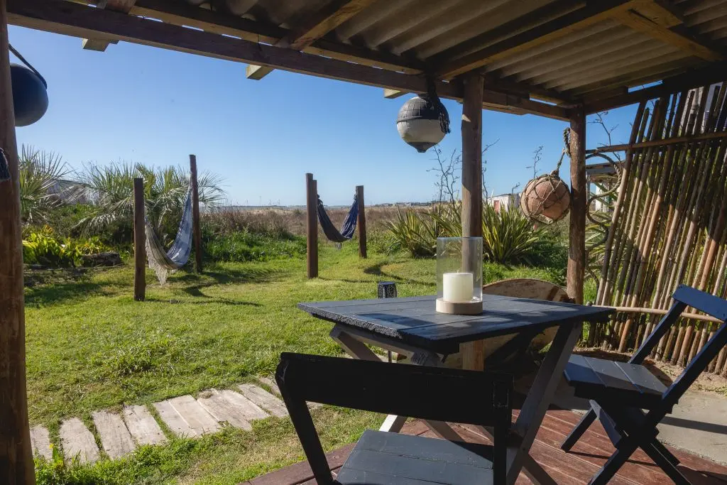 Deck privado con hamaca paraguaya, reposera y mesa con sillas.